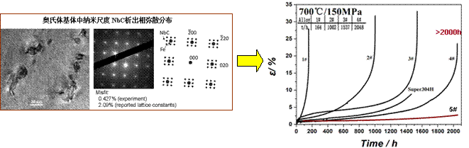 本项目瞄准700°C以上等级超超临界燃煤电站锅炉用管材在极端工况下所面临的科学挑战,在材料成分设计方面兼顾了性能和经济性等综合因素,最新研制的一种含铝奥氏体耐热钢:经蠕变性能测试,外推计算700℃/100MPa应力水平的持久寿命可达到10万小时以上;且在800℃高温空气、及含水蒸汽的环境下具有良好的抗氧化性能。该新型含铝奥氏体耐热钢有望成为 700°C以上等级超超临界电站锅炉用管材的候选材料。