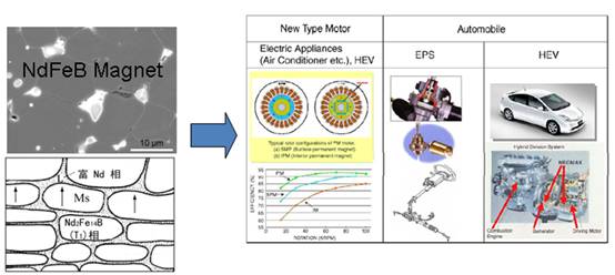 随着混合动力汽车、新能源动力汽车工业的蓬勃发展,研制具有优异高温性能的钕铁硼磁体成为了当下永磁工业界研究的热点和难点。据传统工艺,提高钕铁硼在高温下的永磁性能主要是通过重金属镝对钕的替换加入来实现的。然而,镝作为一种稀缺的稀土资源,其高昂的价格成本成为发展高温钕铁硼的一大挑战,开发低重稀土元素含量的钕铁硼磁体是永磁材料行业的必然发展趋势。从2008年开始,课题组就开始致力于晶界扩散技术在钕铁硼改性方面的研究,该技术既能提高钕铁硼的矫顽力,又不降低剩磁。