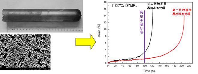 以低密度以成本高稳定性的单晶高温合金为设计目标,利用热力学计算软件JMatPro和相应的镍基高温合金数据库,筛选出了几组低铼且承温能力达到第二代单晶水平的合金成分。可以生长直径4厘米、长度28厘米的镍基高温合金单晶体。在此基础上详细研究了我国第二代镍基单晶高温合金热处理过程中的微观组织结构变化规律,优化了其热处理工艺,使其1100oC/137 MPa高温持久寿命超越了高温合金手册值一倍,达到200小时以上。