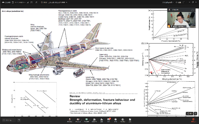 在科研交流环节,郭幼节概述了铝锂合金从基础研究到工程应用的发展历程,并深入分析了铸造与变形铝锂合金在性能、工艺及应用方面的互补性。曾广俊和交大博士生党员戚方舟分别分享了变形与铸造铝锂合金领域的最新研究进展,包括成分设计、性能优化及工程应用方面的突破,充分展示了该领域丰富的科研价值与应用潜力。活动还邀请交大特种材料研究所博士生党支部党员王一浩介绍数值模拟前沿方法。他通过建模与仿真案例,生动展示了计算材料学对实验研究的降本增效作用,拓宽了大家对模拟驱动材料设计新范式的认识。
